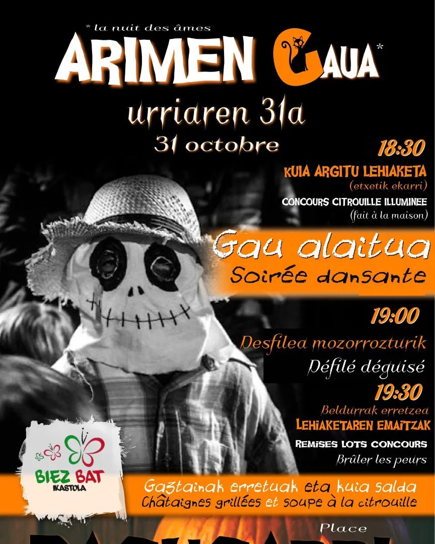Arimen Gaua Basusarrin Ritual events Basque culture Date 2024-10-31 Town Bassussarry (Plaza) Schedule 18:30 Agenda event "BASQUE CULTURE IN THE FAMILY" Argazkia: Adimen Artifiziala Kuia argitu lehiaketa, desfilea mozorroturik... Further details Biez Bat ikastolak antolaturik Receive our free agenda The Basque cultural agenda (weekly) Suscribe