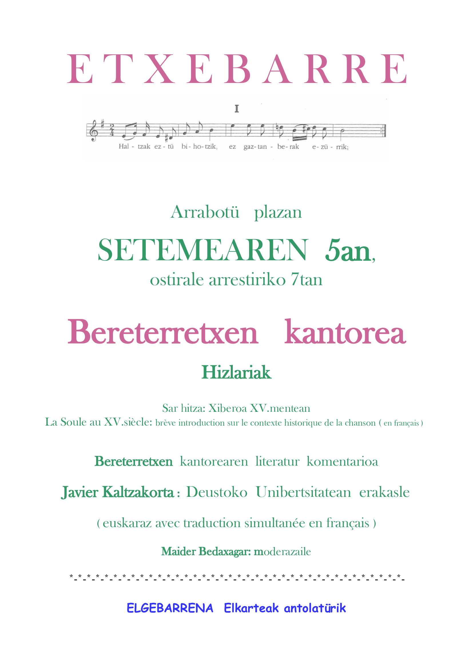- Bereterretxen kantorearen literatur komentarioa, Deustoko Unibertsitatean erakasle den Javier Kaltzakorta-rekin (euskaraz bat-bateko itzulpenarekin frantsesera)