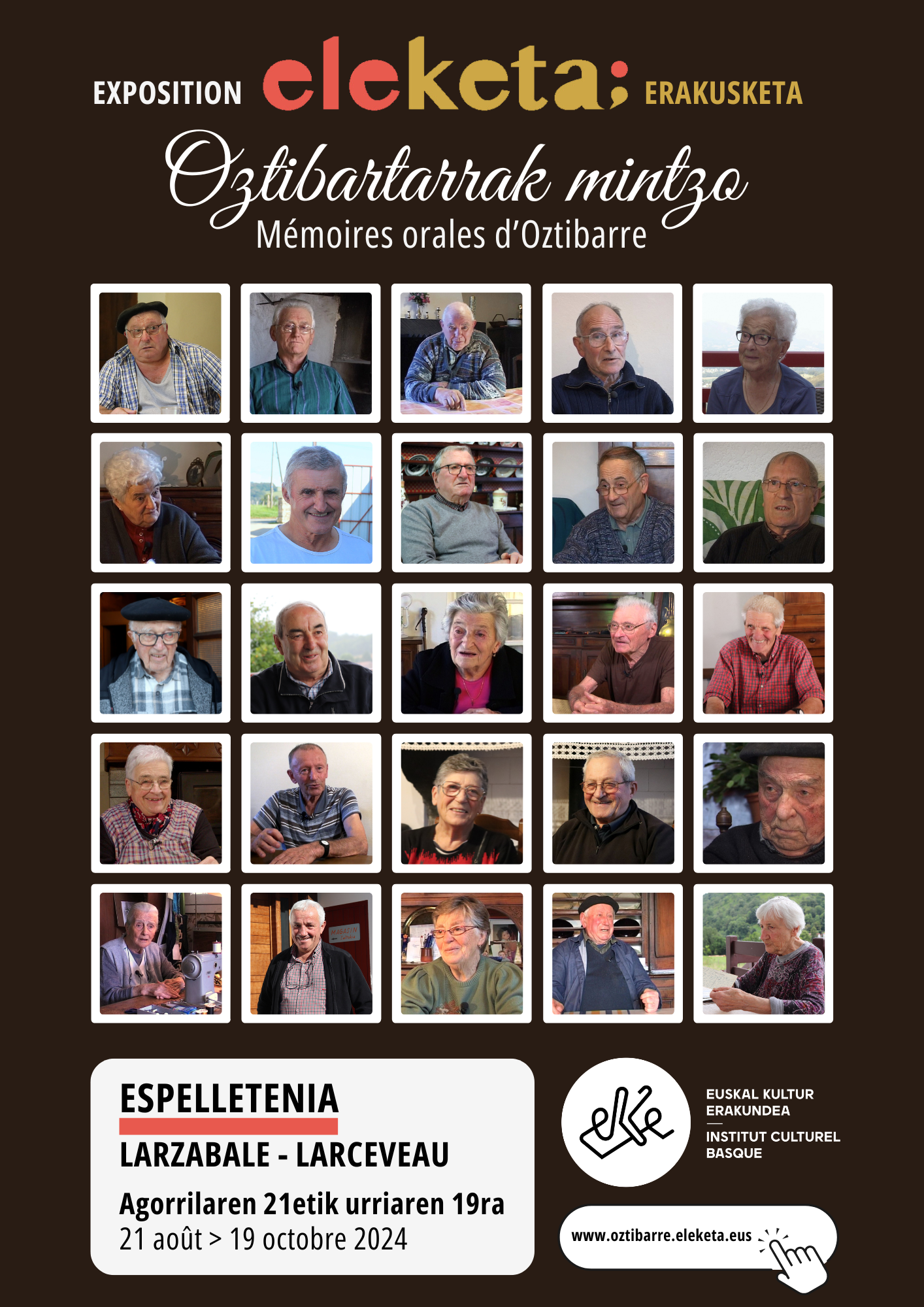 Dans cette exposition multimédia et interactive produite par l'Institut culturel basque en partenariat avec les archives départementales des Pyrénées-Atlantiques, 28 habitant.e.s des communes du territoire d'Oztibarre partagent leurs souvenirs et vécus au travers de témoignages audiovisuels sous-titrés (en basque et français).