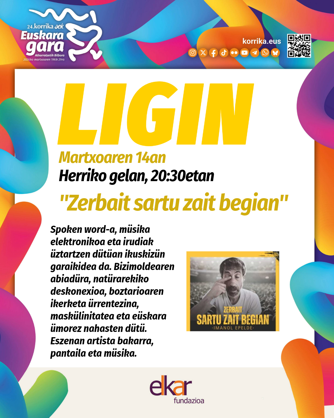 Bagara, baina ez dakigu oso ondo nor. Identitatea eraikitzea ez da erraza mundu azeleratu eta globalizatuan. Bagaude, baina ez dakigu oso ondo non. Hemen eta edonon egon gaitezke aldi berean. Bagoaz, baina ez dakigu oso ondo nora. Ez norbanako bezala, herri bezala. Garai aldakor hauek bizitzeko modua da asmatu ezin duguna. Umorez eta irmotasunez, garai hauek kantatzera eta kontatzera datorren jendaurrekoa da ZERBAIT SARTU ZAIT BEGIAN. Letra bat da ikuskizuna (spoken word-arekin), (berariaz sortutako) kantu (elektroniko) bat, (pantailan proiektatutako) ikus-entzunezko bat.