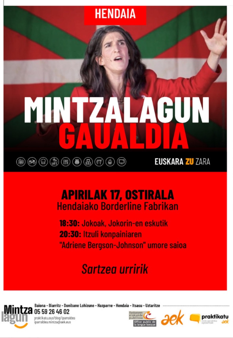 Mintzalagun gaualdia Animation Basque language Theatre Date 2026-04-17 Town Hendaye (Borderline Fabrika) Schedule 18:30 Language Euskara Price Urririk Itzuli konpainia Egitaraua 18:30: jokoak 20:30: Itzuli konpainiaren Adriene Bergson-Johnson ikusgarria Cultural player(s) Borderline Fabrika Itzuli Receive our free agenda The Basque cultural agenda (weekly) Suscribe