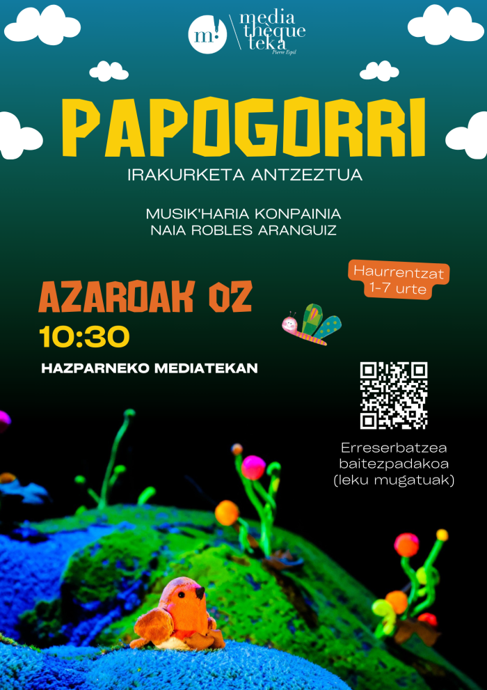 Zatozte Papogorriren abenturen entzutera, Naia Robles Aranguizek kondatuak bere lagun eta konplize den Papogorri txotxongiloaz lagundurik, irakurketa antzeztu batean.