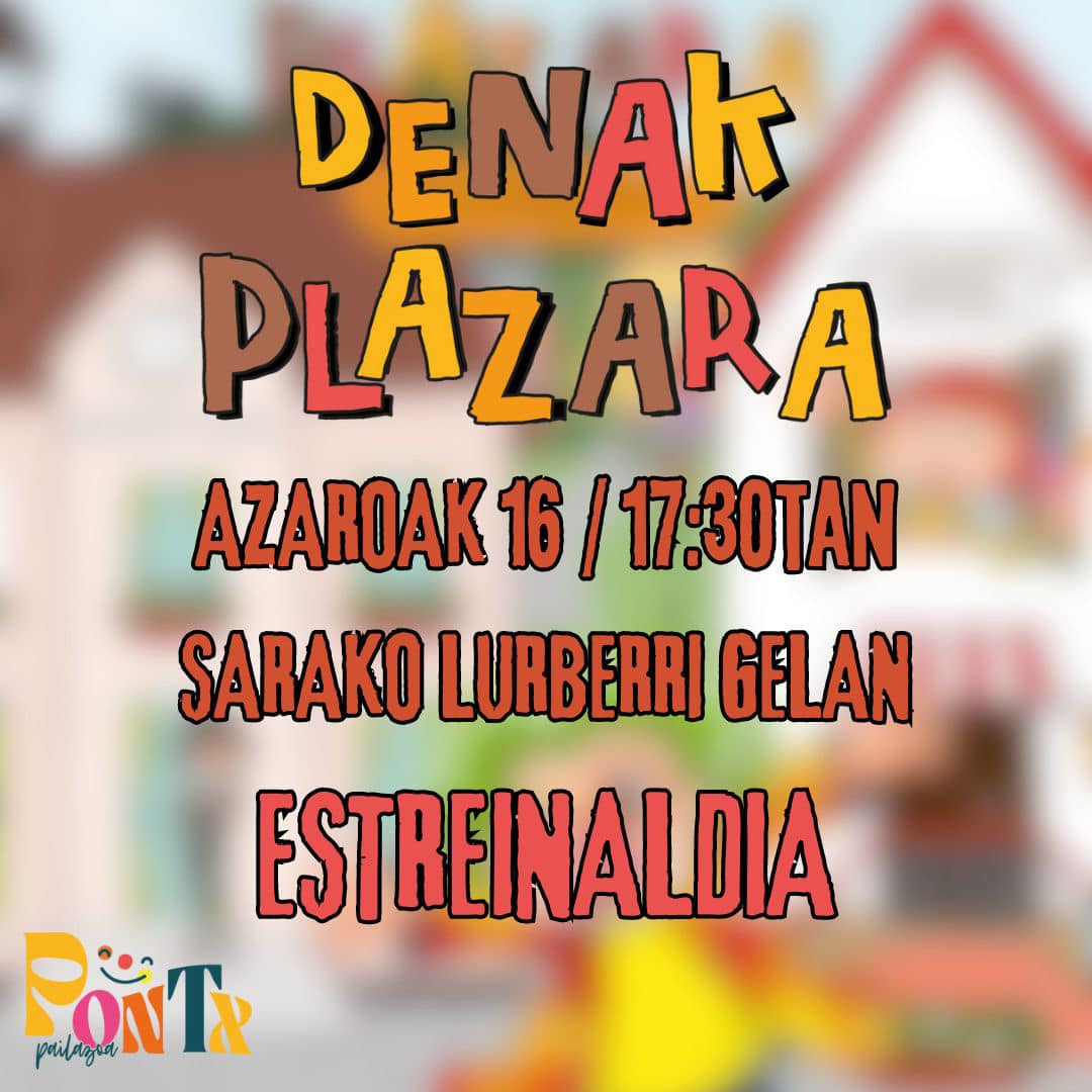 Pontx pailazoa "Denak plazara" Show Theatre Date 2024-11-16 Town Sare (Lur Berri gela) Schedule 17:30 Language Euskara Agenda event "BASQUE CULTURE IN THE FAMILY" Denak plazara ikusgarriaren estreinaldia Receive our free agenda The Basque cultural agenda (weekly) Suscribe