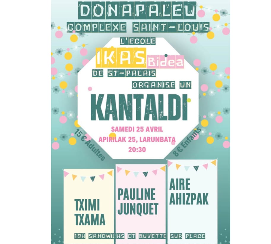 Tximi-Txama + Pauline Junquet + Aire ahizpak Concert Music Date 2026-04-25 Town Saint-Palais (Complexe Saint-Louis) Schedule 20:30 Language Euskara Price Plein tarif : 15€ Adulte. Tarif réduit : 8€ Enfants de moins de 18 ans. Agenda event "BASQUE CULTURE IN THE FAMILY" Aire Ahizpak ©Lorentxa Saragueta Cultural player(s) Pauline Junquet Aire Ahizpak Receive our free agenda The Basque cultural agenda (weekly) Suscribe
