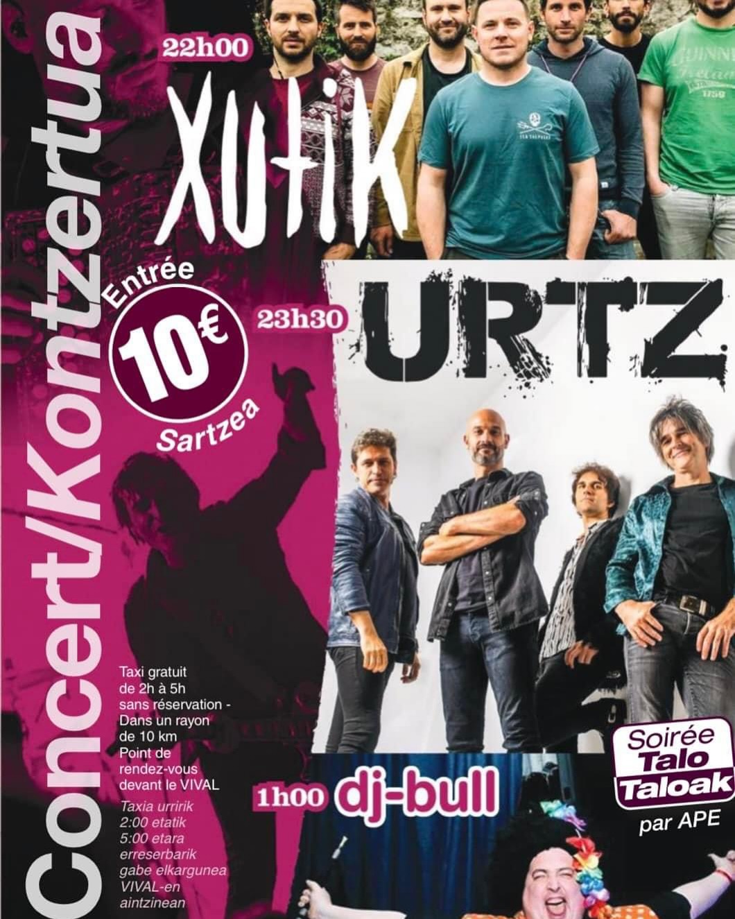 Xutik + Urtz + DJ Bull Concert Music Date 2024-11-09 Town Ahetze (Plaza) Schedule 22:00 Language Euskara Price 10 € Agenda event "BASQUE CULTURE IN THE FAMILY" Urtz Further details Ahetzeko Besten karietara Receive our free agenda The Basque cultural agenda (weekly) Suscribe