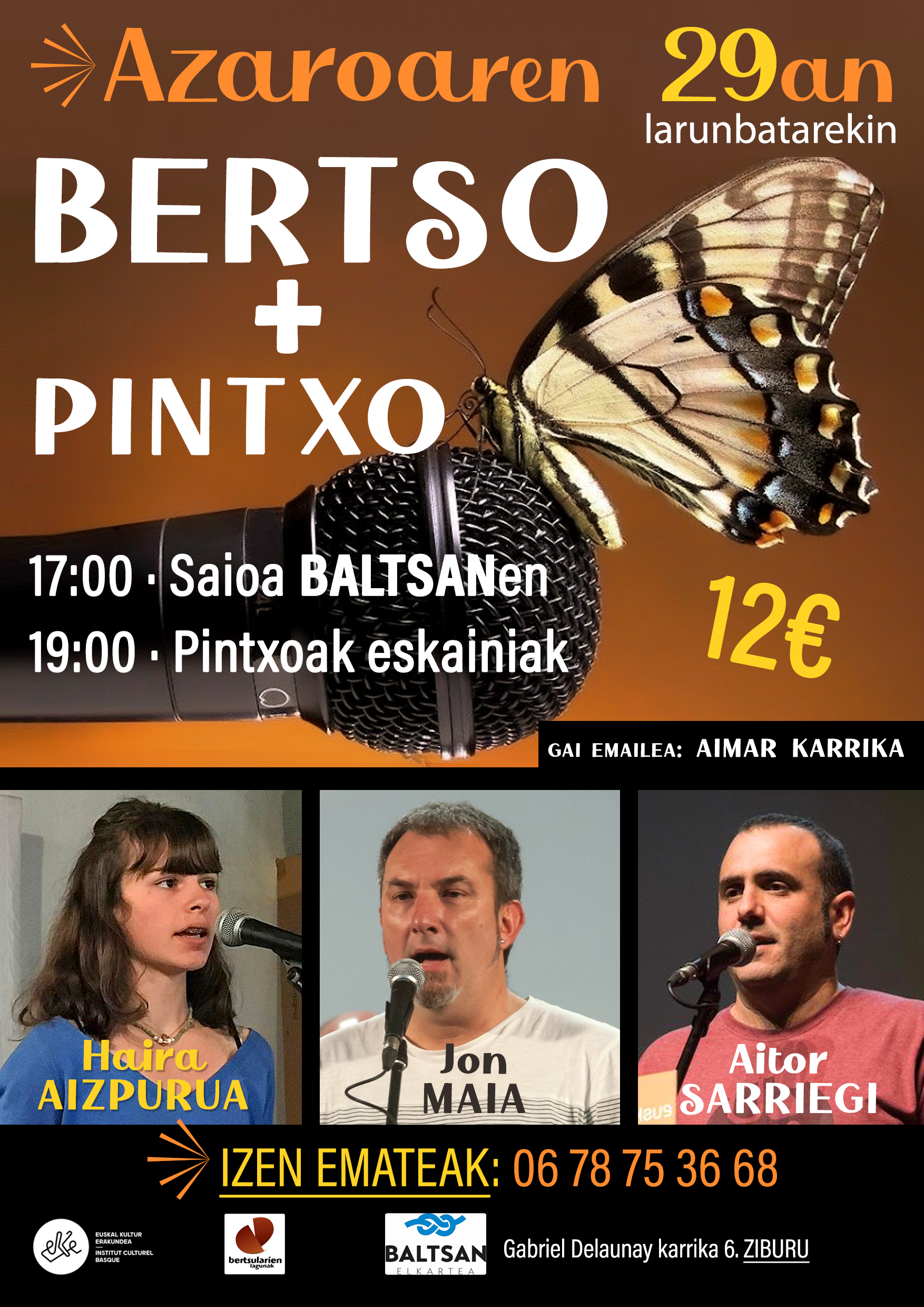 - Bertsolariak: Haira Aizpurua, Jon Maia eta Aitor Sarriegi