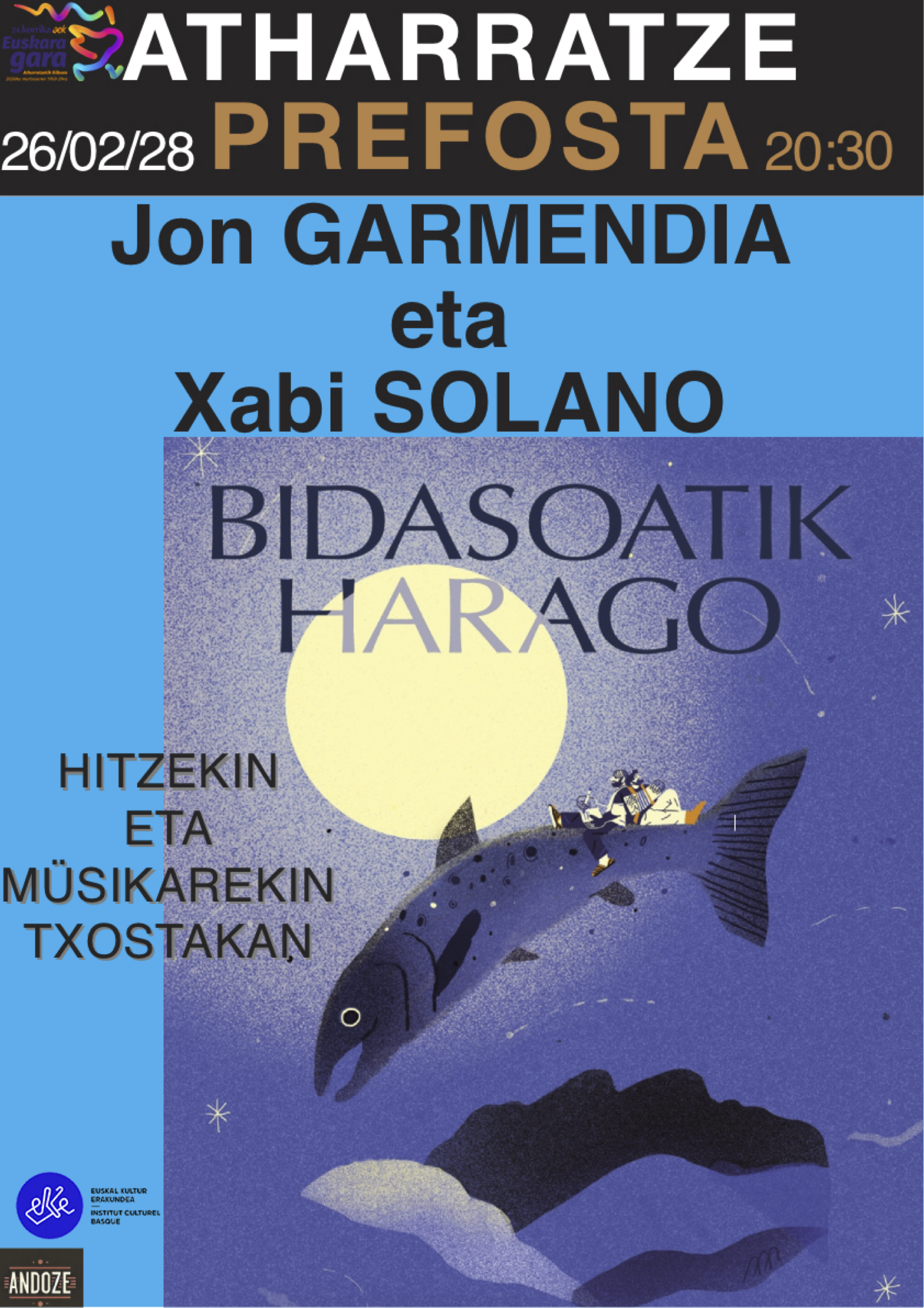 Bidasoatik harago Concierto Canto Música Poesía Fecha 2026-02-28 Municipio Tardets-Sorholus (Prefosta) Horario 20:30 Idioma Euskera En colaboración con el Instituto cultural vasco Evento de la agenda "CULTURA VASCA EN FAMILIA" Jon Garmendia & Xabi Solano, hitzekin eta musikarekin jolasean Actores culturales Prefosta Andoze Reciba gratuitamente nuestra agenda: Agenda de la cultura vasca (una vez a la semana) Suscribirse