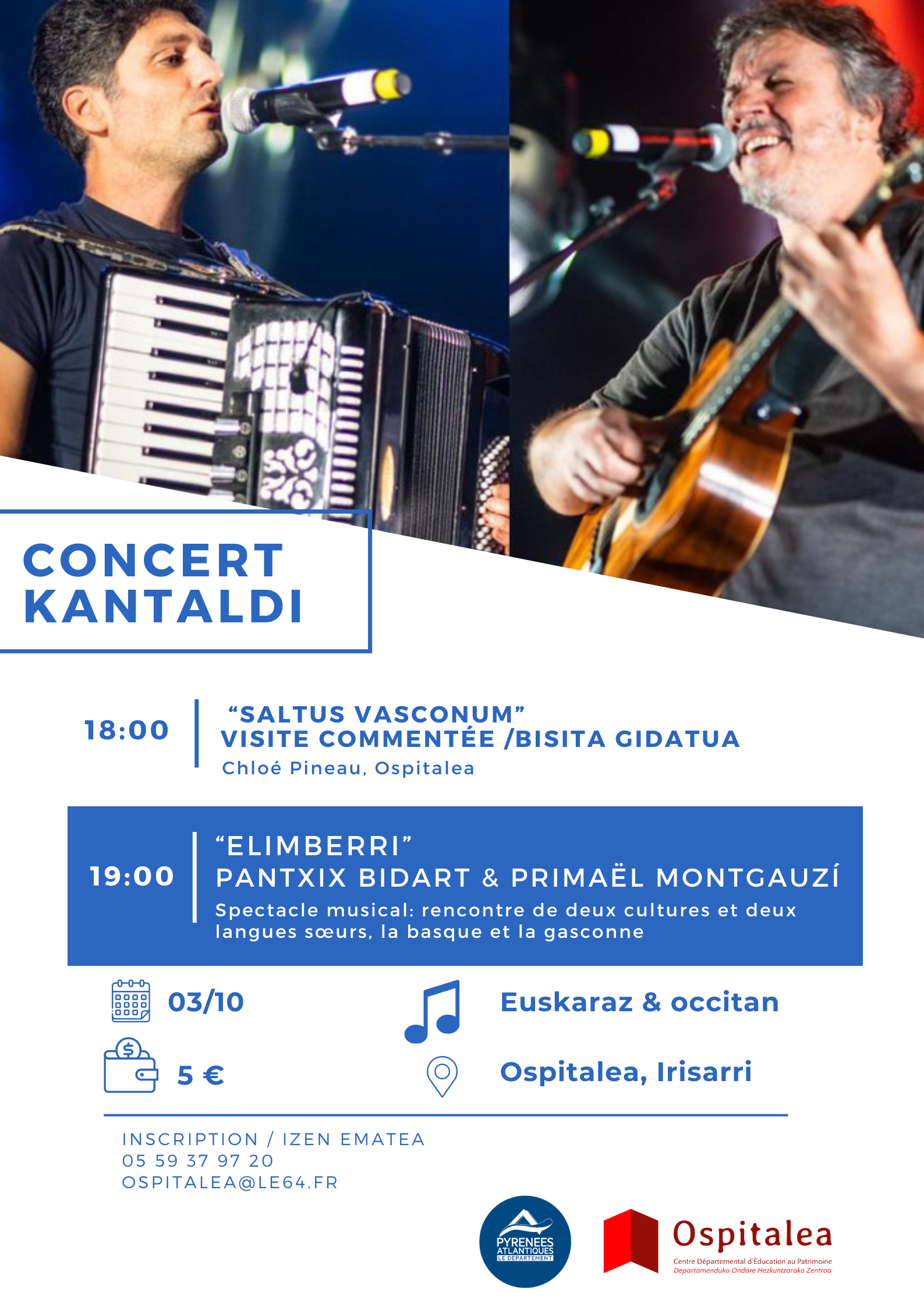 Elimberri Concierto Música Fecha 2025-10-03 Municipio Irissarry (Ospitalea) Horario 19:00 Precio 5 € Más información Tfnoa: 05 59 37 97 20 Actores culturales Ospitalea - Ondare Heziketa Zentroa Pantxix Bidart Reciba gratuitamente nuestra agenda: Agenda de la cultura vasca (una vez a la semana) Suscribirse