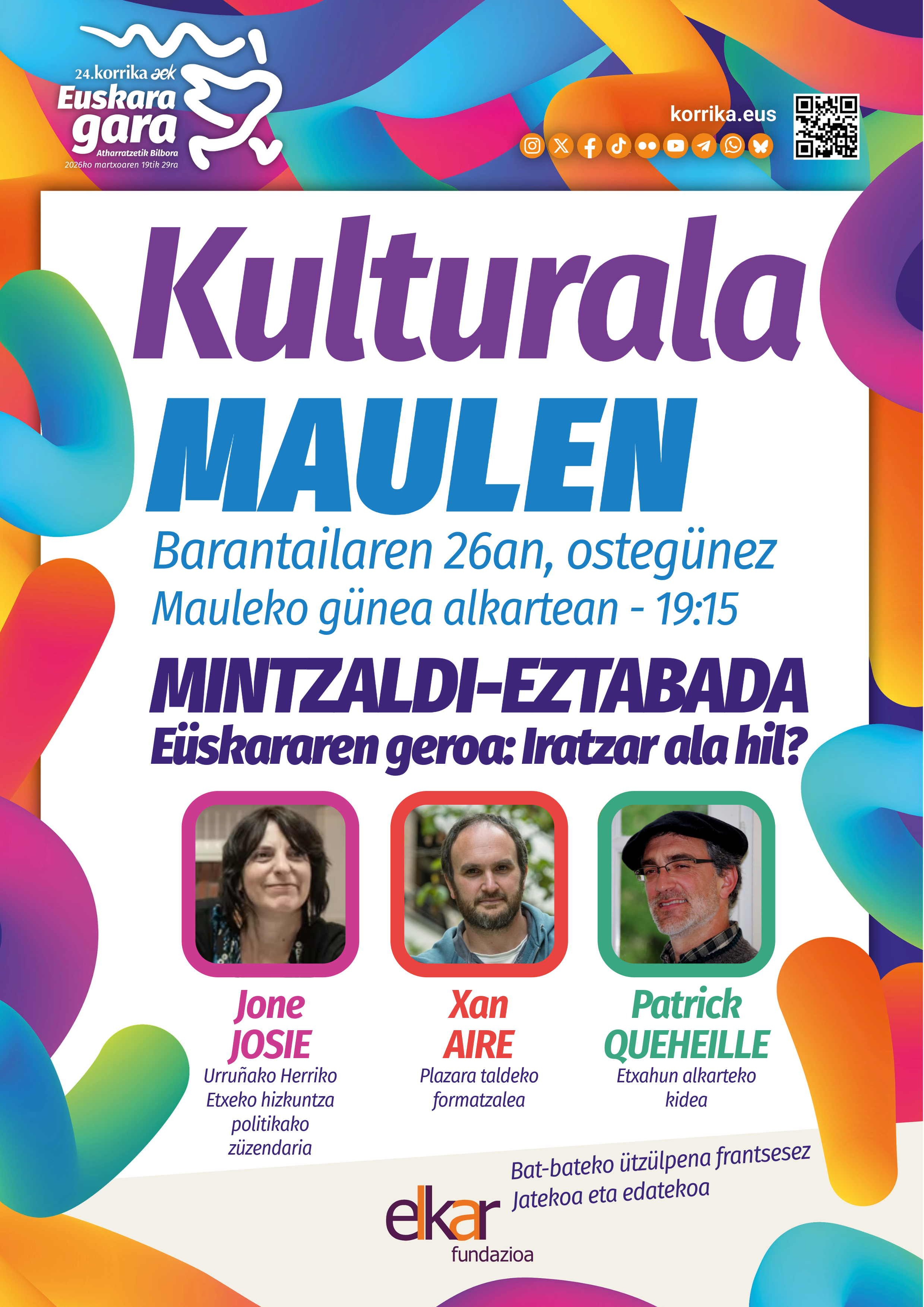 Euskararen geroa: iratzarri ala hil? Conferencia Euskera Fecha 2026-02-26 Municipio Mauléon-Licharre (Günea) Horario 19:15 Idioma Euskera | Francés Parte hartzaileak: Jone Josie, Xan Aire eta Patrick Queheille Más información Korrika kulturalaren karietara Reciba gratuitamente nuestra agenda: Agenda de la cultura vasca (una vez a la semana) Suscribirse