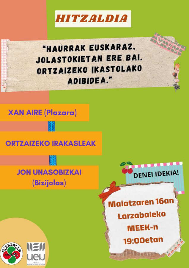 Haurrak euskaraz, jolastokietan ere bai. Ortzaizeko ikastolako adibidea Conferencia Euskera Fecha 2024-05-16 Municipio Larceveau-Arros-Cibits (MEEK) Horario 19:00 Idioma Euskera Precio Urririk Evento de la agenda "CULTURA VASCA EN FAMILIA" Xan Aire Mintzalariak: Xan Aire (Plazara), Ortzaizeko Irakasleak, Jon Unasobizkai (Bizijolas) Reciba gratuitamente nuestra agenda: Agenda de la cultura vasca (una vez a la semana) Suscribirse