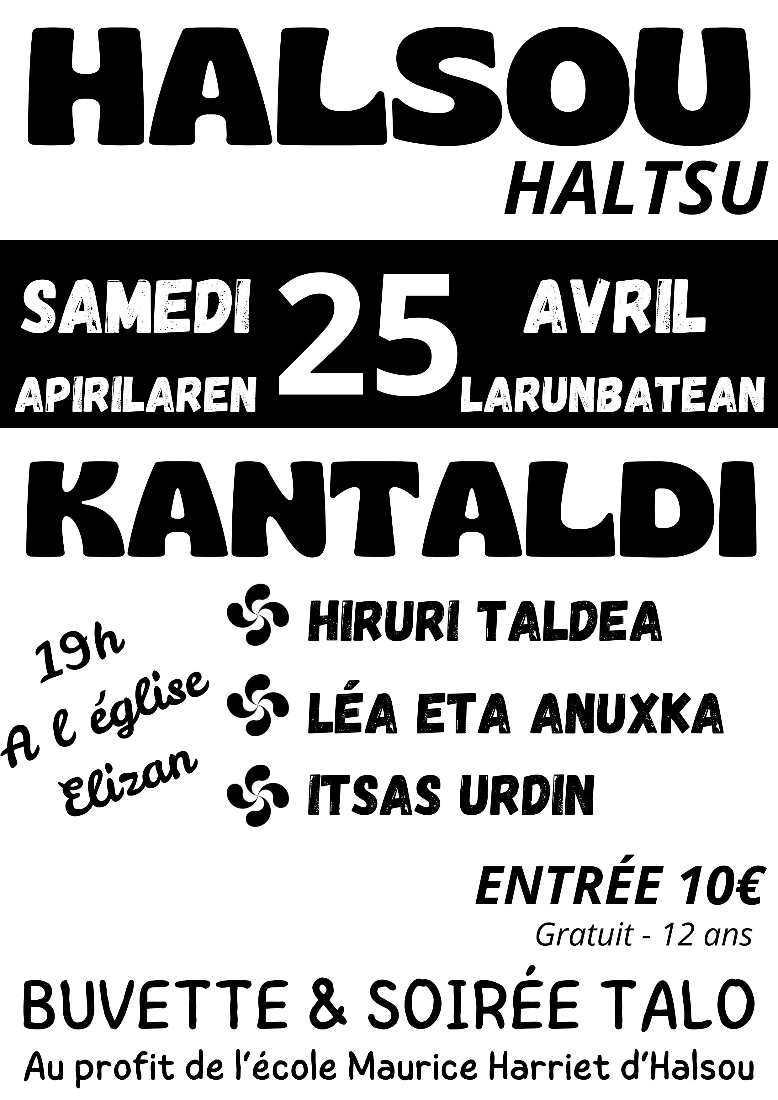 Kantaldia Haltsun Concierto Recital Fecha 2026-04-25 Municipio Halsou (Eliza) Horario 19:00 Idioma Euskera Precio 10 € (12 urtez gorakoentzat) Evento de la agenda "CULTURA VASCA EN FAMILIA" Hiruri Parte hartzaileak: Hiruri taldea, Lea eta Anuxka, Itsas Urdin Más información Maurice Harriet eskolaren alde Reciba gratuitamente nuestra agenda: Agenda de la cultura vasca (una vez a la semana) Suscribirse