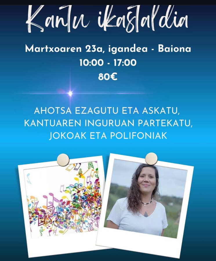 Kantu ikastaldia Talleres y formaciones Canto Fecha 2025-03-23 Municipio Bayonne Horario 10:00-17:00 Idioma Euskera | Francés Precio 80 € Evento de la agenda "CULTURA VASCA EN FAMILIA" Kantu ikastaldia Maialen Errotabehere-rekin Más información Tfnoa: 06 07 98 21 68 Reciba gratuitamente nuestra agenda: Agenda de la cultura vasca (una vez a la semana) Suscribirse