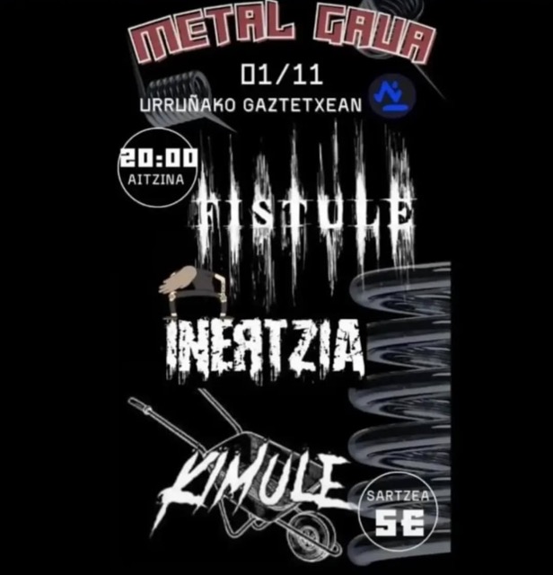 Metal Gaua Concierto Música Fecha 2025-01-11 Municipio Urrugne (Gaztetxea) Horario 20:00 Idioma Euskera Precio 5 € Inertzia Taldeak: Fistule, Inertzia, Kimule Reciba gratuitamente nuestra agenda: Agenda de la cultura vasca (una vez a la semana) Suscribirse