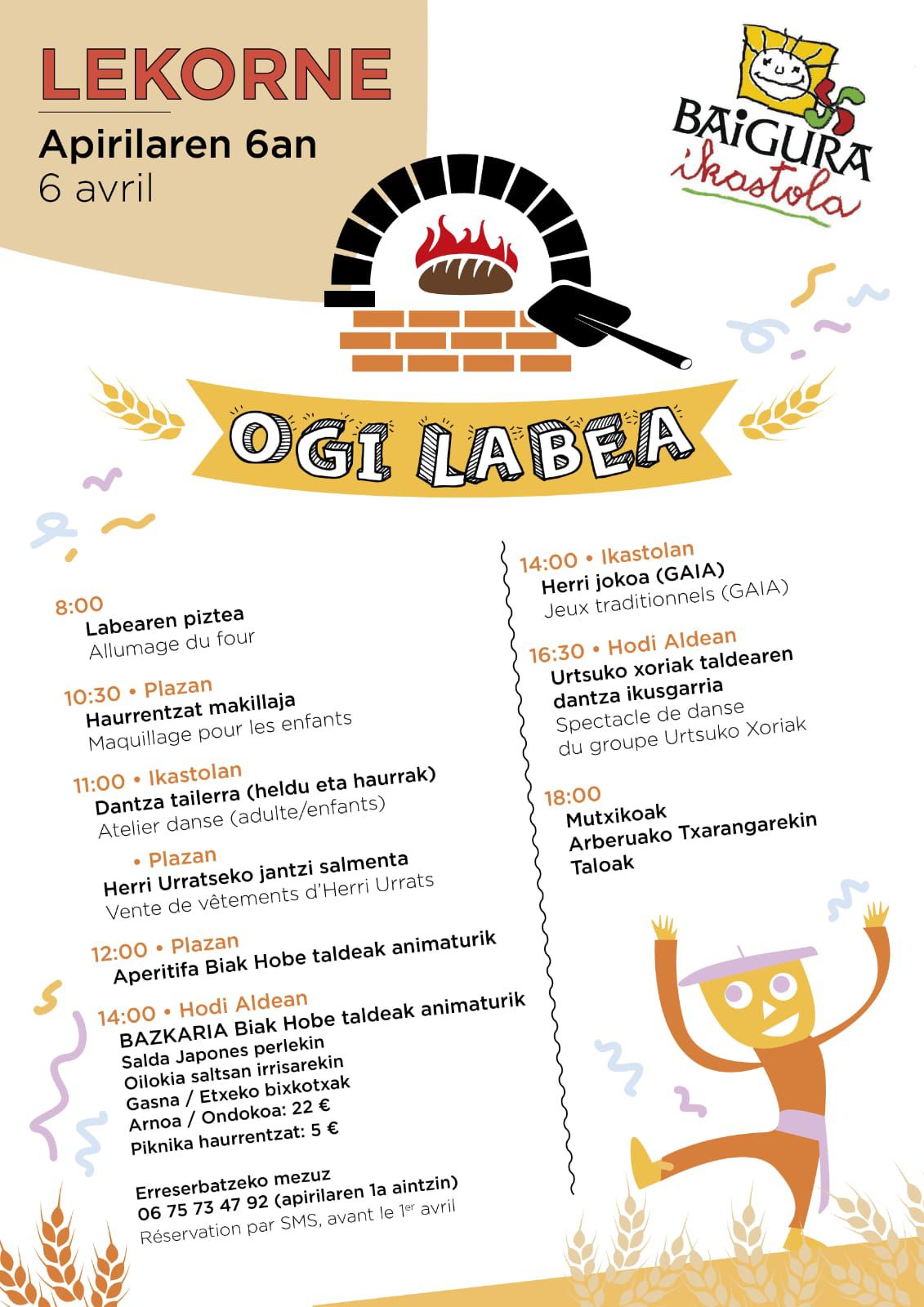 Ogi labearen besta Acontecimientos y festivales Cultura vasca Fecha 2025-04-06 Municipio Mendionde Horario 8:00 Evento de la agenda "CULTURA VASCA EN FAMILIA" Labearen piztea, dantza tailerra, bazkaria, herri jokoa, dantza ikusgarria, mutxikoak... Más información Baigura ikastolak antolaturik Reciba gratuitamente nuestra agenda: Agenda de la cultura vasca (una vez a la semana) Suscribirse