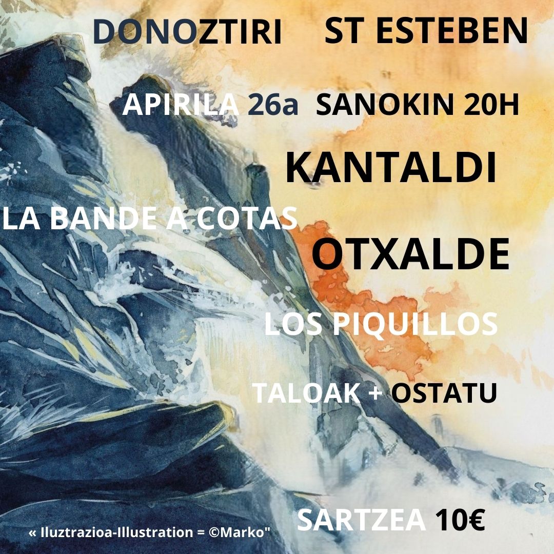 Otxalde + La Bande a Cotas + Los Piquillos Concierto Música Fecha 2025-04-26 Municipio Saint-Esteben (Sanoki gela) Horario 20:00 Precio 10 € Evento de la agenda "CULTURA VASCA EN FAMILIA" Actores culturales Otxalde Reciba gratuitamente nuestra agenda: Agenda de la cultura vasca (una vez a la semana) Suscribirse