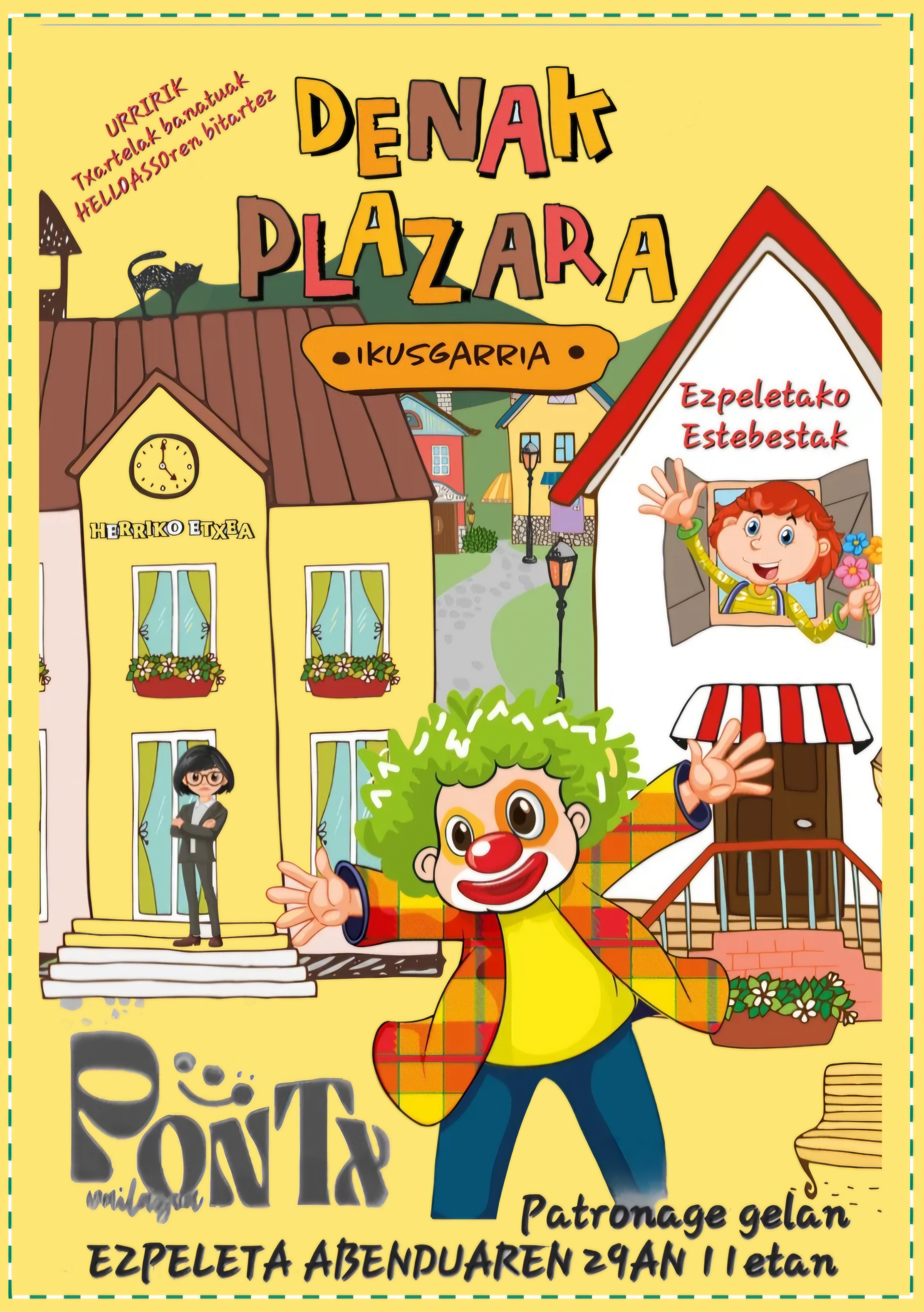 Pontx pailazoa "Denak plazara" Espectáculo Teatro Fecha 2024-12-29 Municipio Espelette (Patronaiaren gela) Horario 11:00 Idioma Euskera Evento de la agenda "CULTURA VASCA EN FAMILIA" Más información Denak plazara - Prentsa txostena Reciba gratuitamente nuestra agenda: Agenda de la cultura vasca (una vez a la semana) Suscribirse