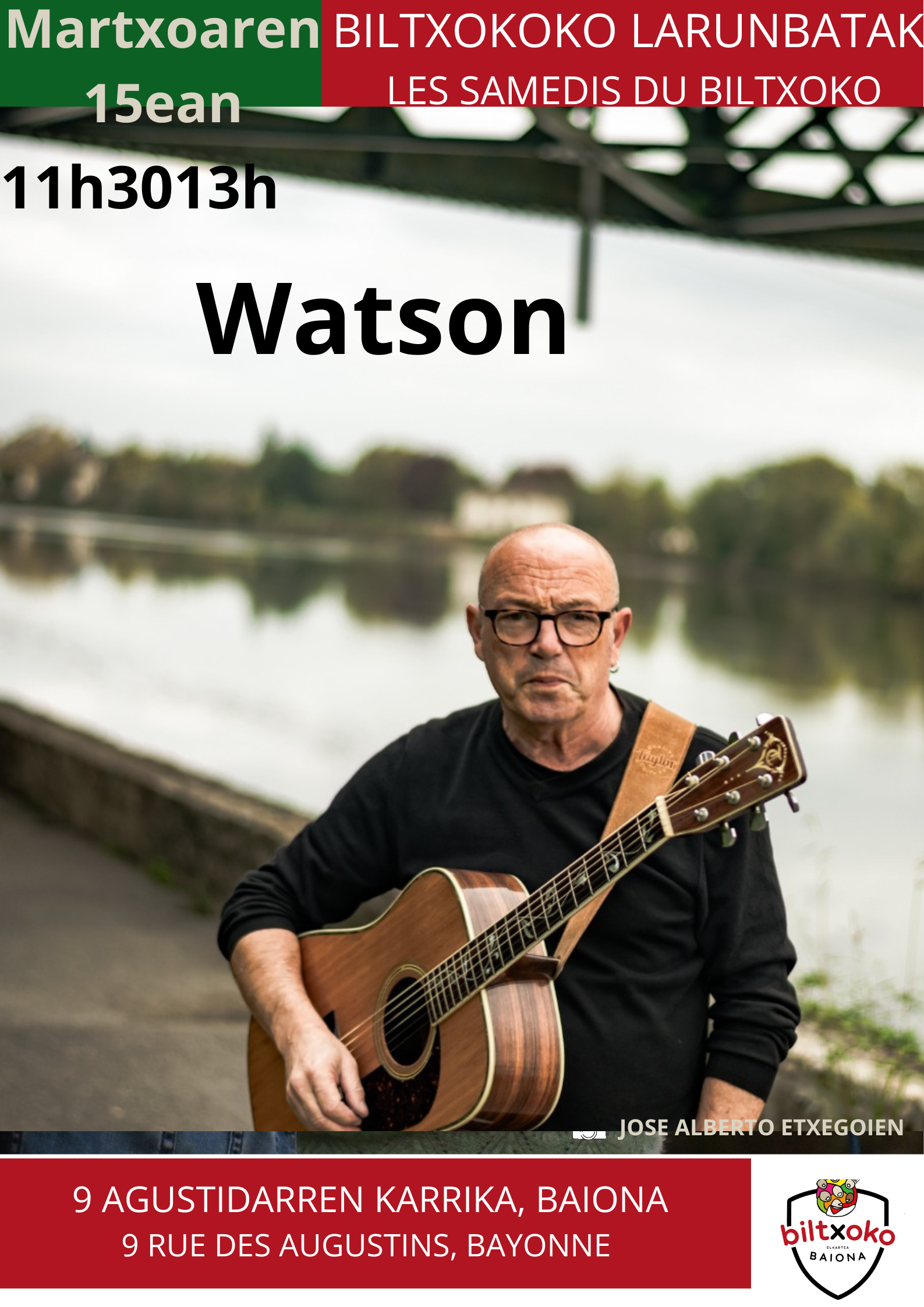 Watson Concierto Música Fecha 2025-03-15 Municipio Bayonne (Biltxoko) Horario 11:30 Idioma Euskera Evento de la agenda "CULTURA VASCA EN FAMILIA" Más información Biltxokoko larunbaten karietara Reciba gratuitamente nuestra agenda: Agenda de la cultura vasca (una vez a la semana) Suscribirse