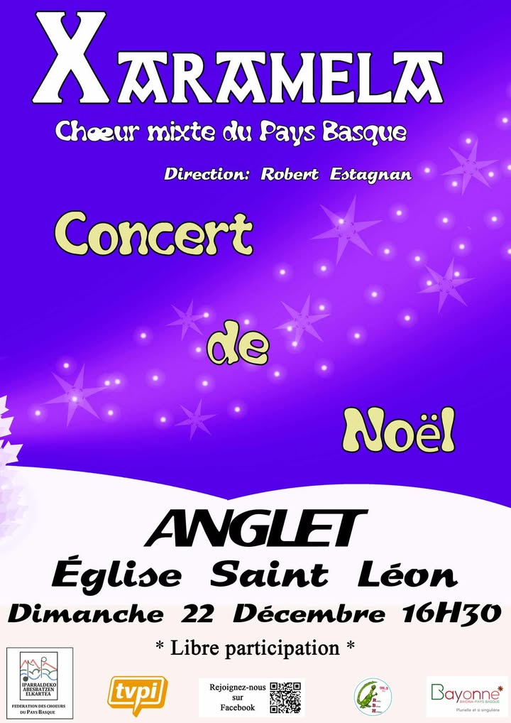 Xaramela Concierto Canto coral Fecha 2024-12-22 Municipio Anglet (San Leon eliza) Horario 16:30 Idioma Euskera Precio Bakoitzak nahi duena Evento de la agenda "CULTURA VASCA EN FAMILIA" Actores culturales Xaramela Reciba gratuitamente nuestra agenda: Agenda de la cultura vasca (una vez a la semana) Suscribirse