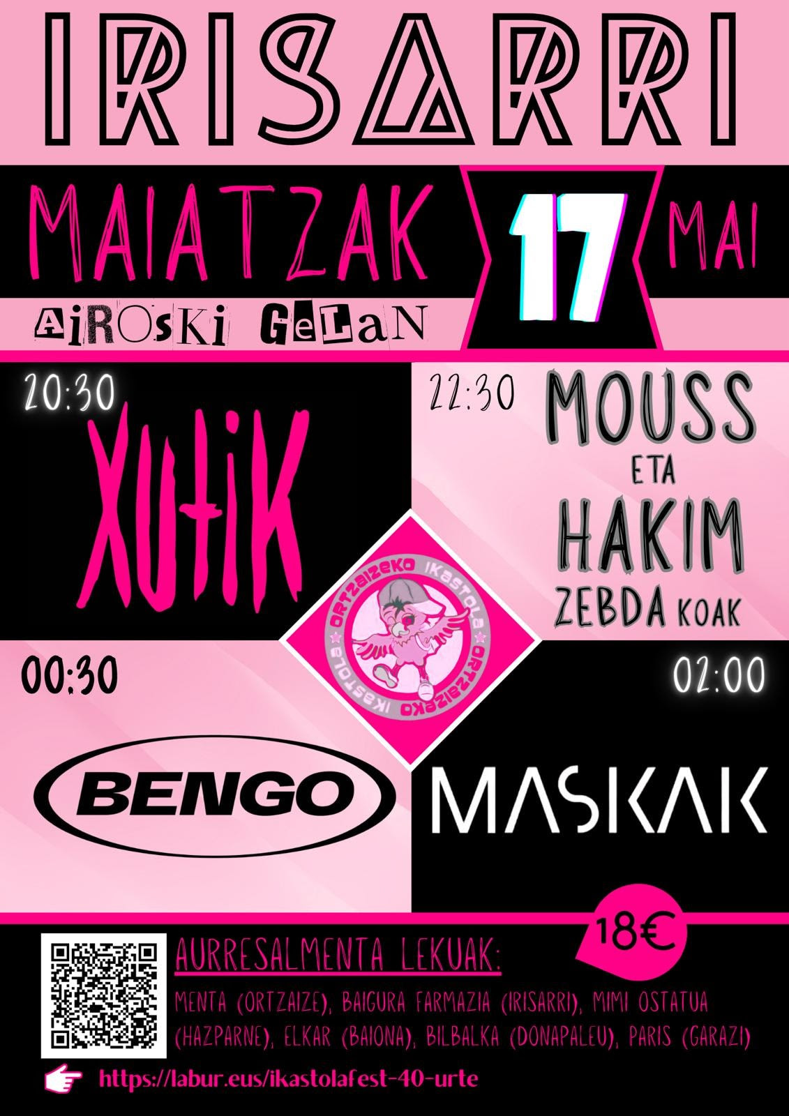 Xutik + Mouss & Hakim + Bengo + Maskak Concierto Música Fecha 2025-05-17 Municipio Irissarry (Airoski gela) Horario 20:30 Idioma Euskera | Francés Precio 18 € Evento de la agenda "CULTURA VASCA EN FAMILIA" Maskak Más información Ortzaizeko ikastolak antolaturik Reciba gratuitamente nuestra agenda: Agenda de la cultura vasca (una vez a la semana) Suscribirse