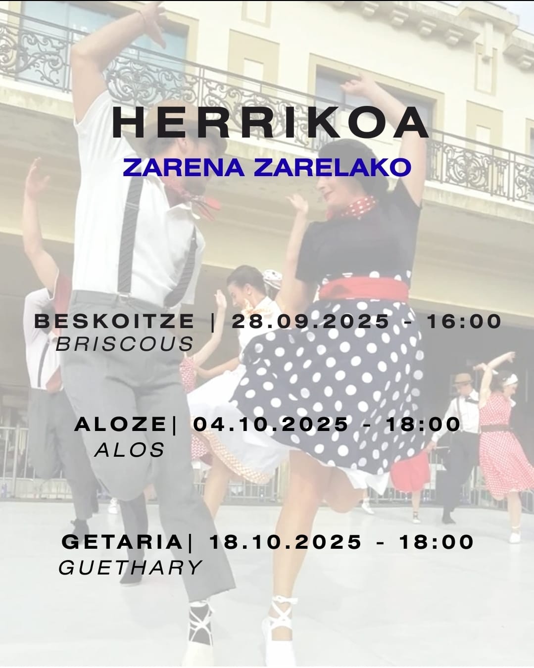 Zarena Zarelako "Herrikoa" Espectáculo Danza Fecha 2025-10-04 Municipio Alos-Sibas-Abense Horario 18:00 Evento de la agenda "CULTURA VASCA EN FAMILIA" Actores culturales Zarena Zarelako Reciba gratuitamente nuestra agenda: Agenda de la cultura vasca (una vez a la semana) Suscribirse
