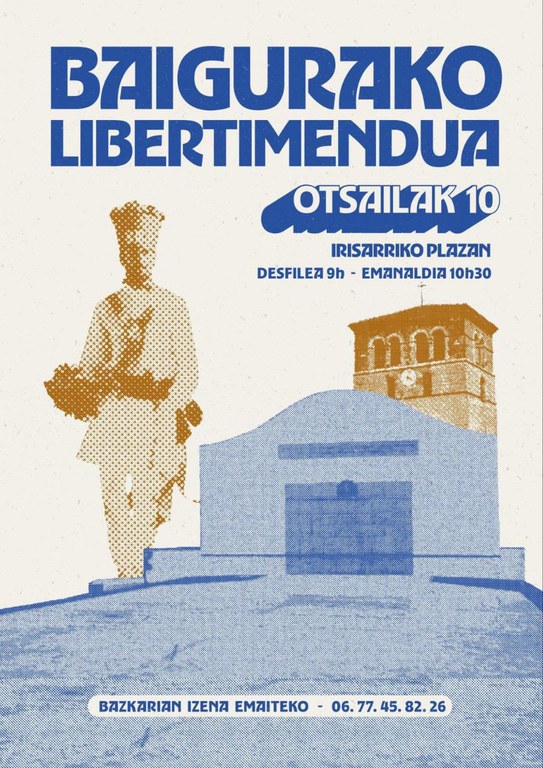 Baigurako Libertimendua Gertakari erritualak Inauteriak Data 2024-02-10 Herria Irisarri (Plaza) Tenorea 9:00 Hizkuntza Euskara "Kultura familian" agendako gertakaria Baigurako Libertimendua 2022an - Argazkia: Maitane Hernandez Egitaraua9:00: desfilea10:30: emanaldiaAfitxa: Kultura agenda eskuratu emailez Euskal kulturaren agenda (Astero) Harpidetu