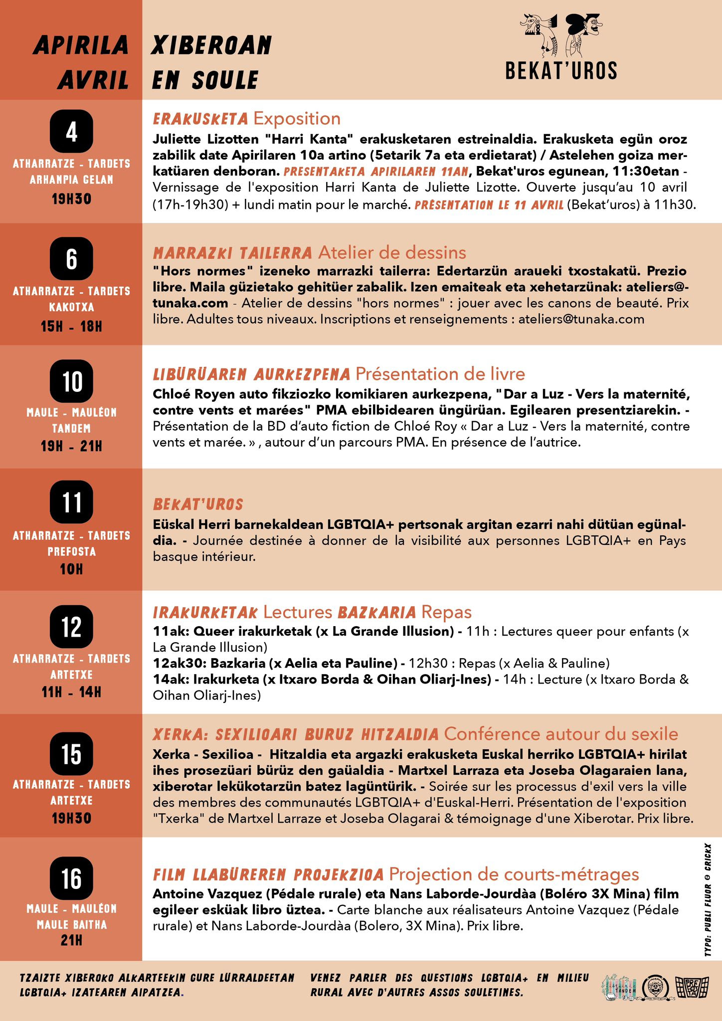 Harri kanta erakusketa Atharratzen, marrazki tailerra, Bekat'uros eguna, irakurketak, mintzaldia, film laburren proiekzioa Maulen...