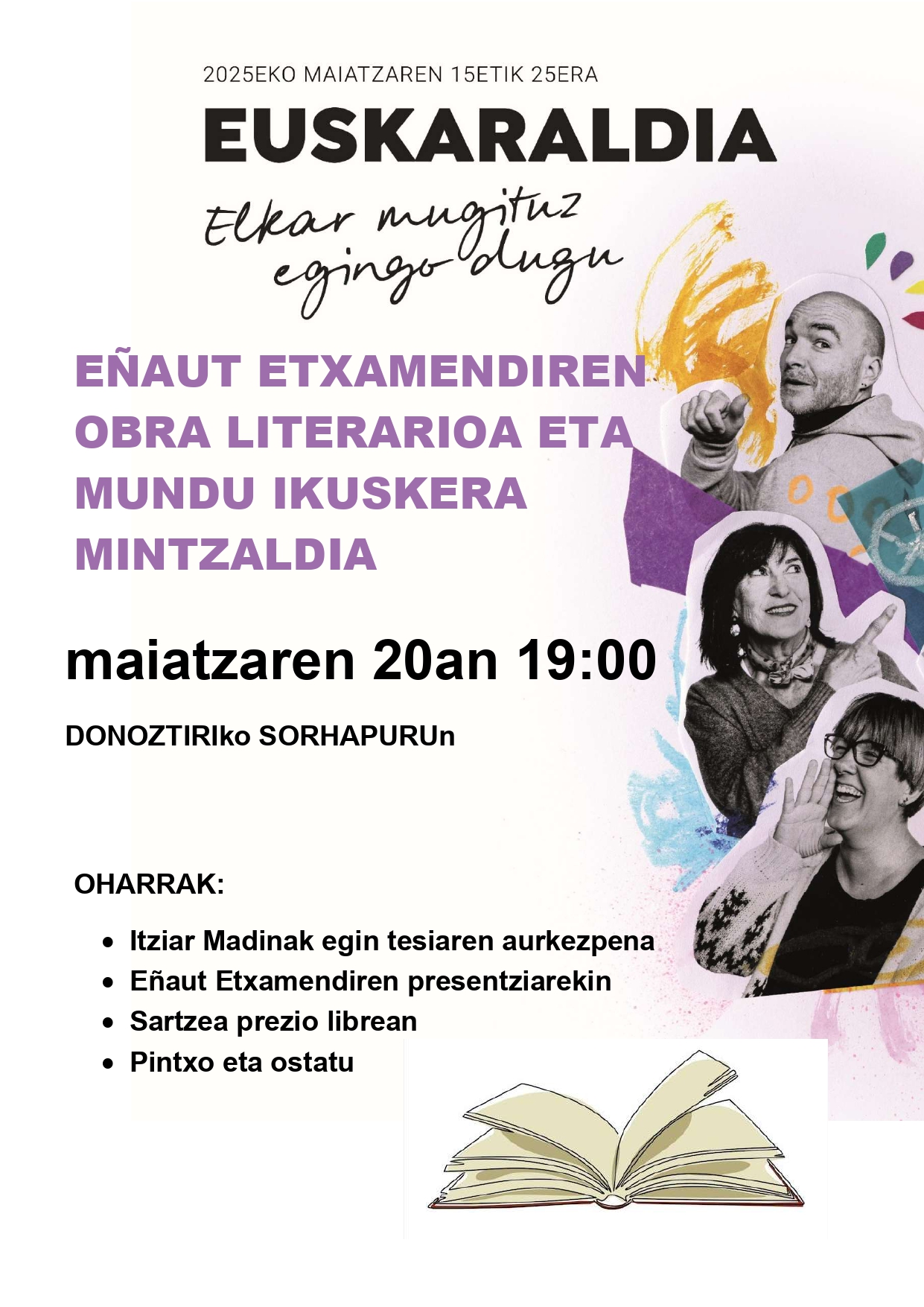 Eñaut Etxamendiren obra literarioa eta mundu ikuskera Hitzaldiak Literatura Data 2025-05-20 Herria Donoztiri (Sorhapuru) Tenorea 19:00 Hizkuntza Euskara Prezioa Prezio librea Eñaut Etxamendi Itziar Madinak egin tesiaren aurkezpena, Eñaut Etxamendiren presentziarekin Xehetasunak Euskaraldiaren karietara Kultura agenda eskuratu emailez Euskal kulturaren agenda (Astero) Harpidetu