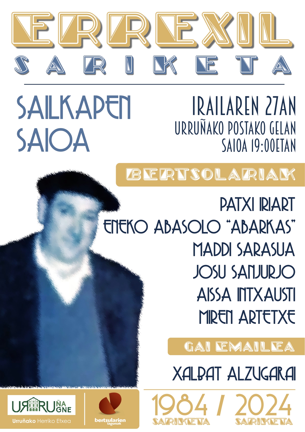 - Bertsolariak: Patxi Iriart, Eneko Abasolo "Abarkas", Maddi Sarasua, Josu Sanjurjo, Aissa Intxausti eta Miren Artetxe