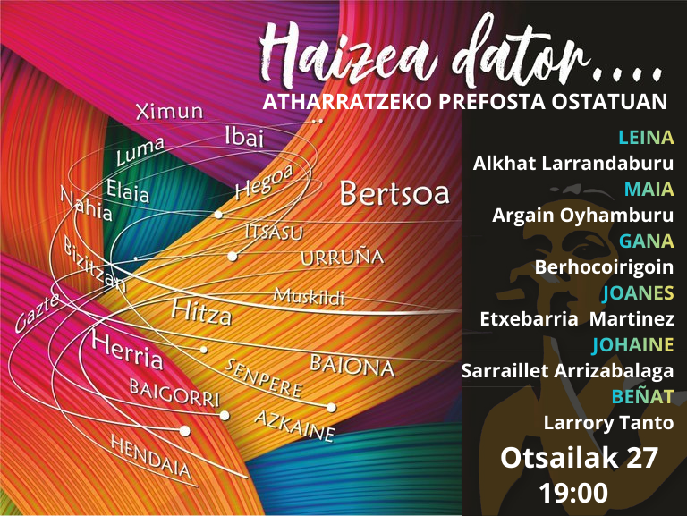 Bertsolariak: Leina Alkhat Larrandaburu, Maia Argain Oyhamburu, Gana Berhocoirigoin, Joanes Etxebarria Martinez, Johaine Sarraillet Arrizabalaga, Beñat Larrory Tanto