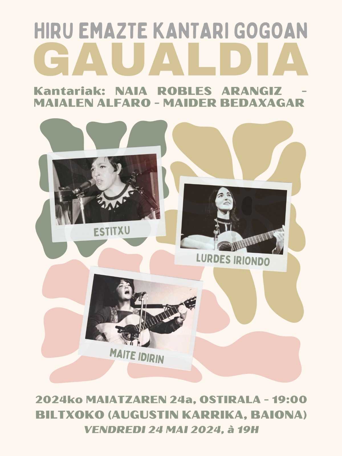 Hiru emazte kantari gogoan Kontzertuak Kantaldia Data 2024-05-24 Herria Baiona (Biltxoko) Tenorea 19:00 Hizkuntza Euskara Naia Robles Arangiz Kantariak: Naia Robles Arangiz, Maialen Alfaro, Maider Bedaxagar Kultura agenda eskuratu emailez Euskal kulturaren agenda (Astero) Harpidetu