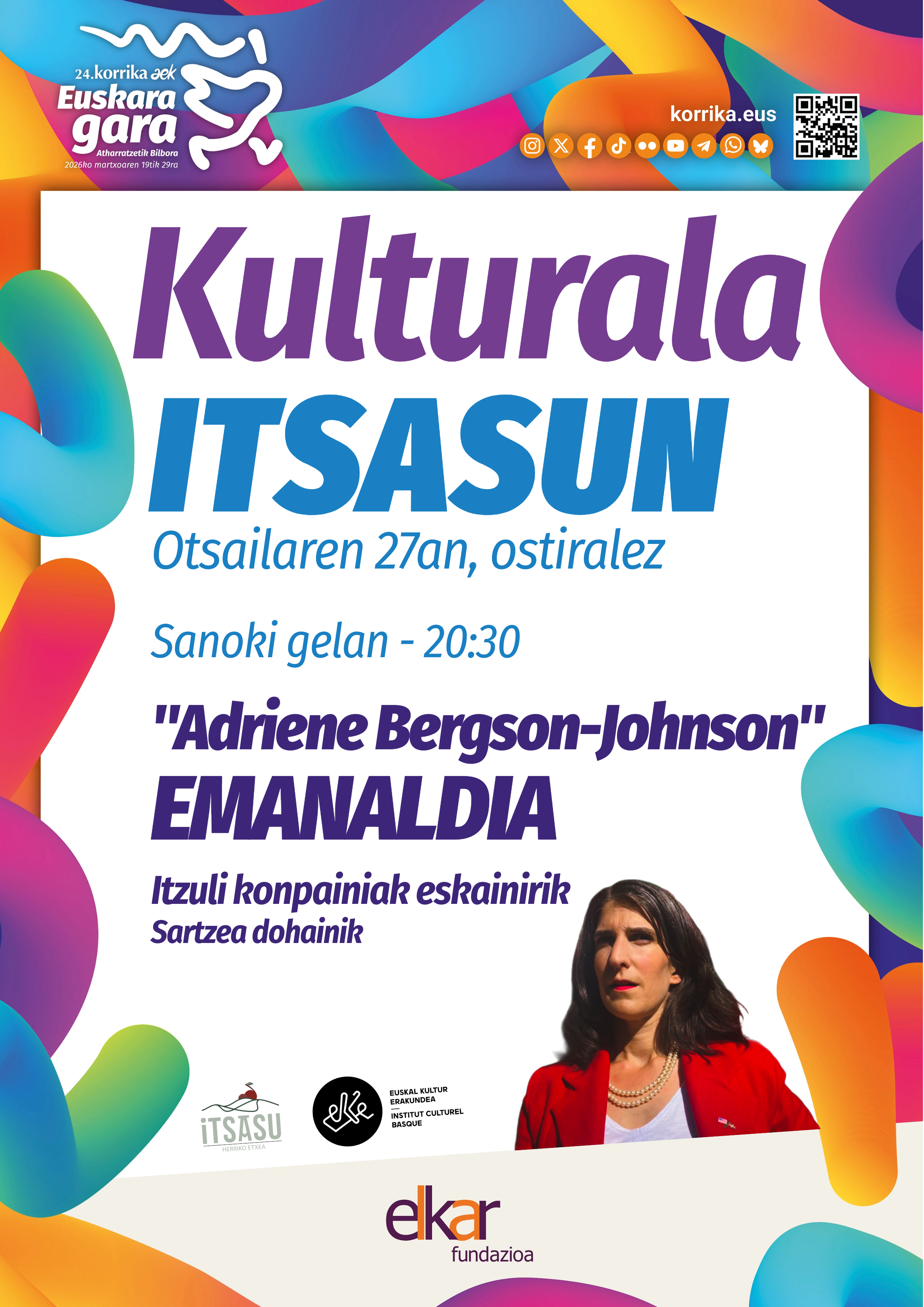 Itzuli konpainia "Adriene Bergson-Johnson" Ikuskizunak Antzerkia Data 2026-02-27 Herria Itsasu (Sanoki gela) Tenorea 20:30 Hizkuntza Euskara Prezioa Urririk Euskal kultur erakundearen partaidetzarekin "Kultura familian" agendako gertakaria Argazkia: Itzuli konpainia Xehetasunak Korrika kulturalaren karietara Kultura eragileak Itzuli Kultura agenda eskuratu emailez Euskal kulturaren agenda (Astero) Harpidetu