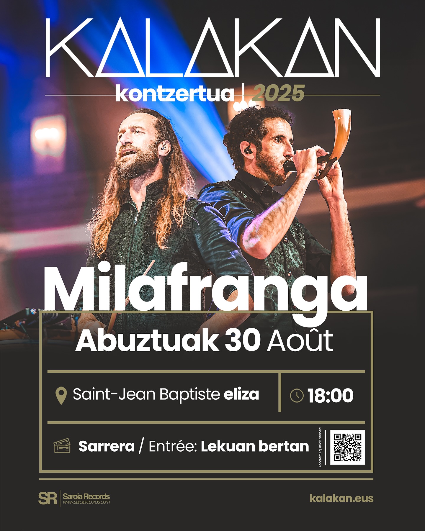Kalakan Kontzertuak Musika Data 2025-08-30 Herria Milafranga (Eliza) Tenorea 18:00 Hizkuntza Euskara "Kultura familian" agendako gertakaria Xehetasunak Sartzean lekuan berean salgai Kultura eragileak Kalakan Kultura agenda eskuratu emailez Euskal kulturaren agenda (Astero) Harpidetu