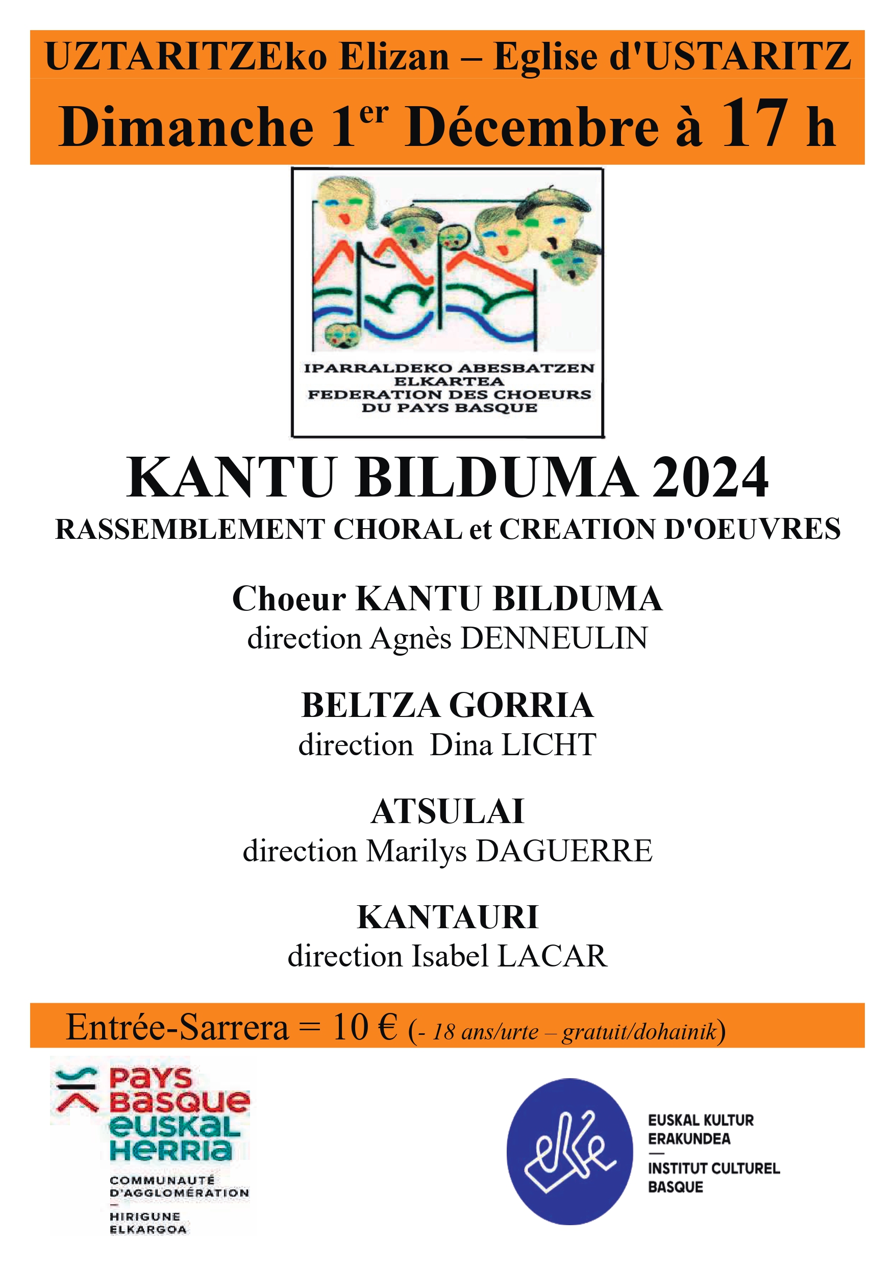 Kantu bilduma 2024 Kontzertuak Koru kantua Data 2024-12-01 Herria Uztaritze (Eliza) Tenorea 17:00 Hizkuntza Euskara Prezioa 10 € (urririk 18 urte arte) Euskal kultur erakundearen partaidetzarekin Kantauri abesbatza Koruak: Kantu Bilduma, Beltza Gorria, Atsulai, Kantauri Kultura agenda eskuratu emailez Euskal kulturaren agenda (Astero) Harpidetu