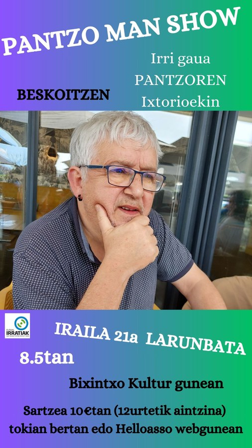 Pantzo Man Show Ikuskizunak Antzerkia Data 2024-09-21 Herria Beskoitze (Bixintxo kulturgunea) Tenorea 20:30 Hizkuntza Euskara Prezioa 10 € (urririk 12 urte arte) "Kultura familian" agendako gertakaria Irri gaua Pantzoren ixtorioekin Kultura eragileak Bixintxo Bixintxo kulturgunea Kultura agenda eskuratu emailez Euskal kulturaren agenda (Astero) Harpidetu