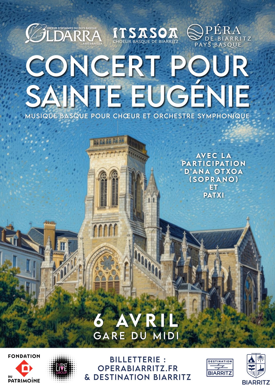 Santa Eugeniaren aldeko kontzertua Kontzertuak Koru kantua Data 2026-04-06 Herria Biarritz (Gare du Midi) Tenorea 16:00 & 19:00 Hizkuntza Euskara Prezioa 15 eta 50 euro artean Itsasoa Oldarra eta Itsasoa koruen, bai eta Biarritzeko Operaren parte hartzearekin Kultura agenda eskuratu emailez Euskal kulturaren agenda (Astero) Harpidetu
