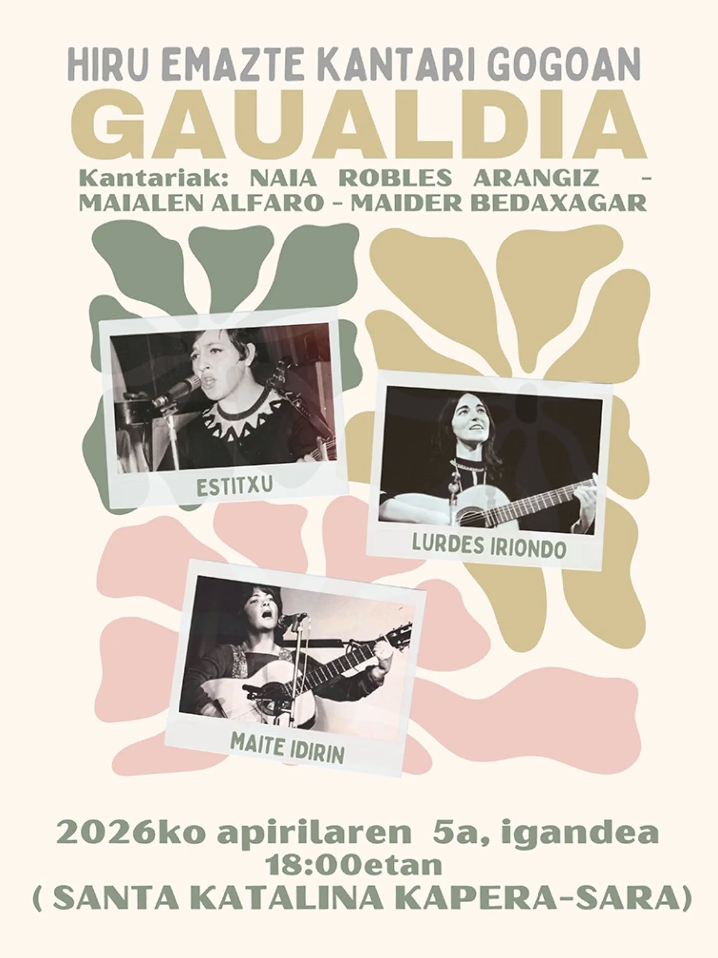Estibaliz Robles Estitxu, Maite Idirin et Lourdes Iriondo ont été des pionnières de la musique basque. À Getxo, sept autres femmes d'Iparralde leur rendront hommage : Maialen Alfaro, Maider Bedaxagar et Naia Robles interpréteront leurs chansons, tandis que Patxika Alfaro, Jacqueline Iriart, Maite Ithurbide et Pantxika Heguiapal se chargeront de les présenter.